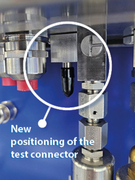 Bei den Vakuum-Leckanzeigern VLR 410 PMMV für doppelwandige Rohre geht der Prüfstutzen für den Sauganschluss künftig nicht länger horizontal ab. Er ist dann gewinkelt und zeigt nach unten.